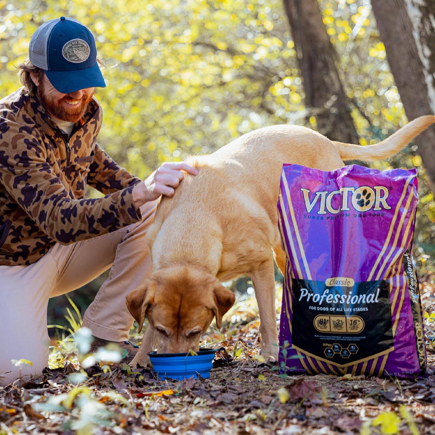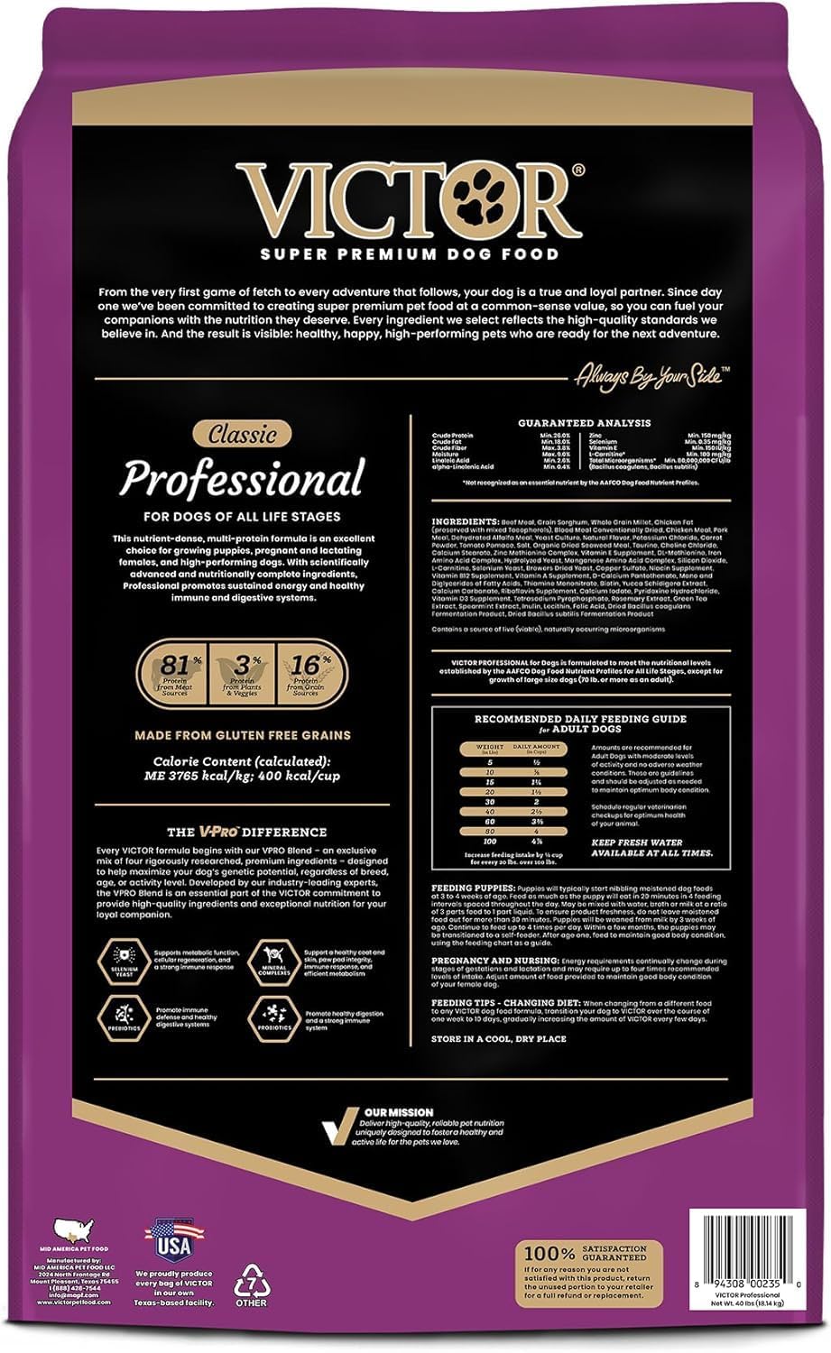 CLASSIC – PROFESSIONAL: Originally developed for dog breeders and trainers, this nutrient-dense dog food for active dogs is an excellent dry dog food for dogs that need high levels of quality protein, including growing puppies and pregnant or nursing females. Made with premium-quality beef, chicken and pork meals, this high energy dog food provides the sustained energy required by sporting dogs and active dogs with high physical demands. This multi-protein dog food is fortified with vitamins, minerals, essential fatty acids, protein and amino acids, and promotes a healthy immune system and digestive health. Suitable for all life stages, this food for active dogs is a dry kibble with 26% protein and 18% fat, and is 3765 KCAL/KG or 400 KCAL/CUP. The protein in this nutrient-rich dog food and puppy food comes from high-quality meat sources (81%), plants and veggies (3%) and gluten free grain sources (16%). VICTOR Professional dog food is part of our Classic line, which is uniquely balanced for active dogs with scientifically advanced and nutritionally complete ingredients. VICTOR Professional dog food promotes sustained energy and optimal performance for active dogs and puppies. VICTOR SUPER PREMIUM DOG FOOD: Every VICTOR dog kibble formula is created with our proven VPRO Blend of ingredients – an exclusive mix designed by industry-leading experts to support superior digestibility, strong immune system function, and healthy skin and coat for every dog, regardless of breed, age, or activity level. And the result is visible: healthy, happy pets who are ready for the next adventure. We proudly produce every bag of VICTOR dry pet food in our own Texas-based facility, and each ingredient used is carefully selected and serves a nutritional purpose. A majority of the ingredients in our dog kibble comes from ranches, farms and other trusted suppliers who are within a day’s drive of our plant.