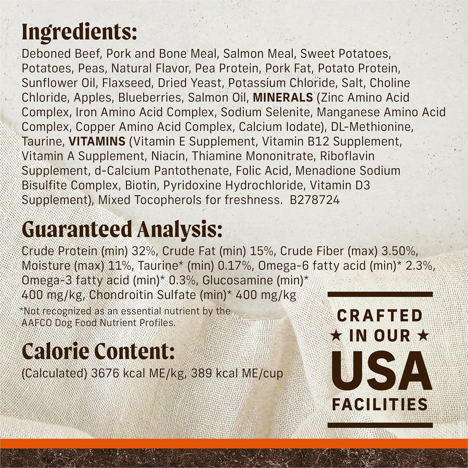 Serve your dog food they will love with Merrick Grain Free Dry Dog Food, Real Texas Beef And Sweet Potato Recipe. Real deboned beef is the first ingredient in this real meat dog food. This holistic blend of kibble provides a high protein dog food option that helps maintain lean muscle mass and energy levels. With 63% protein and healthy fat ingredients and 37% produce, fiber, vitamins, minerals and other natural ingredients, this complete and balanced dog food is rich in protein. This adult dog food also contains omega fatty acids to help support your dog’s healthy skin and coat. Additionally, this premium kibble helps maintain healthy hips and joints by providing high levels of glucosamine and chondroitin for dogs. Wholesome ingredients are prioritized in this grain free dog food, and so it is made without corn, wheat, soy, gluten or artificial colors, flavors, or preservatives. Merrick dog food recipes are proudly founded in Hereford, Texas, crafted in USA facilities.