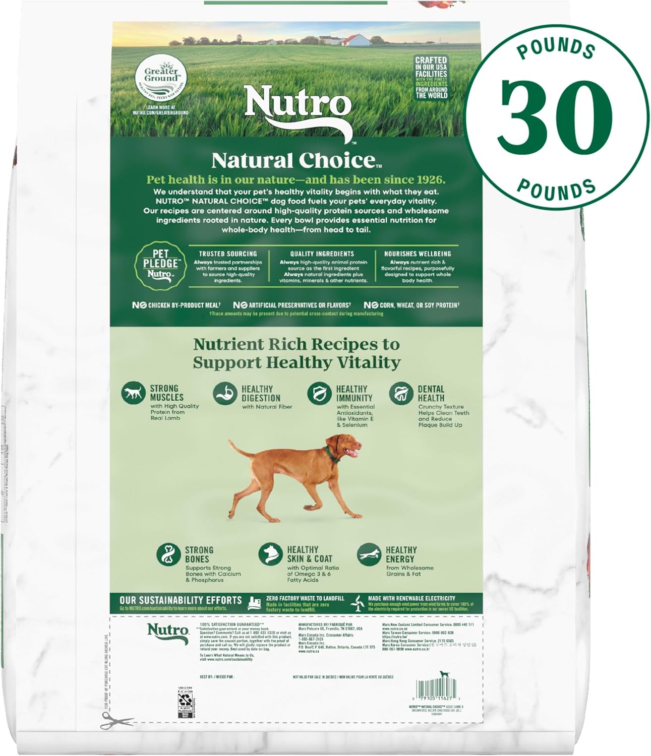 We understand that pet owners want the best for their dogs That’s why Nutro has a partnership with trusted farmers and suppliers to source high-quality ingredients, giving your dog quality nutrition both you and your pet will appreciate Made with lamb as the #1 ingredient, and crafted with vitamins, minerals, and other nutrients, Nutro Natural Choice Adult Dry Dog Food, Lamb & Brown Rice Recipe brings real, recognizable ingredients to every mealtime Crafted with Omega 3 & 6 Fatty Acids, this dry dog food promotes healthy skin and a soft, shiny coat There is no chicken by-product meal, corn, wheat, or soy protein and no artificial flavors, colors, or preservatives in this quality dry dog food recipe, although trace amounts may be present due to potential cross-contact during manufacturing With ingredients that promote healthy skin and coat, digestion, and immunity, this dry dog food recipe also supports your dog’s vitality Packed with delicious flavor, high quality ingredients, and supportive benefits, serve your furry loved one something they will love with Nutro Natural Choice Dry Dog Food Recipes